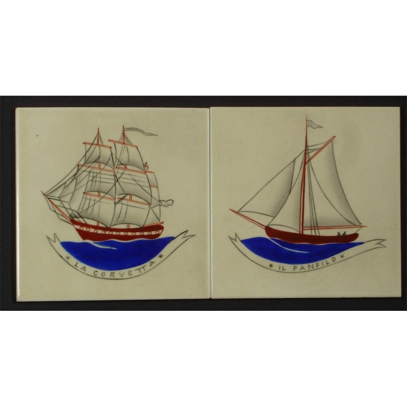 A pair of Richard Ginori tiles the design attributed to Gio Ponti, each painted with a boat at full sail, in colours impressed marks 14.5cm. square
