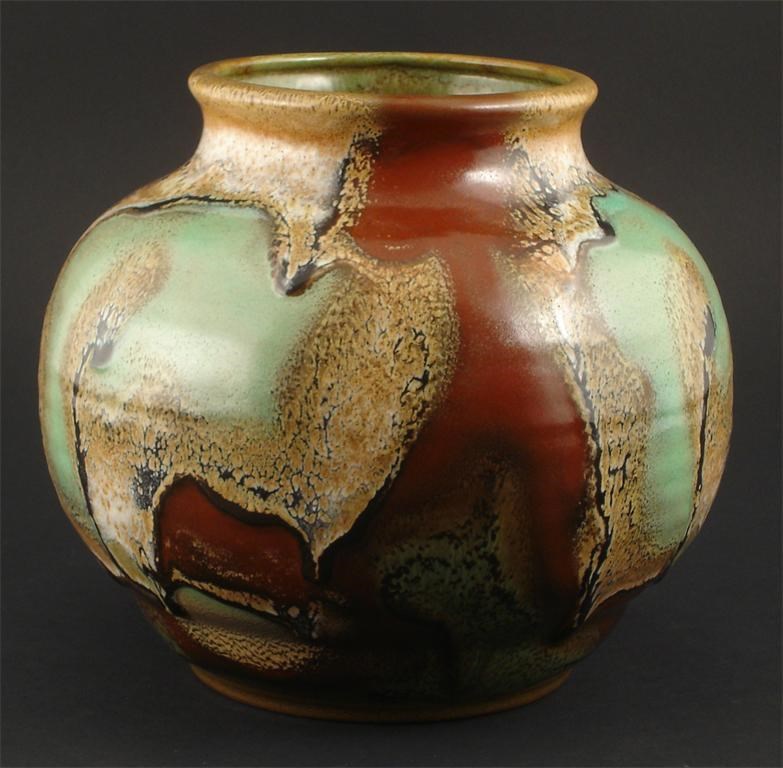 A Gouda Pottery vase made for Liberty & Co, ovoid with collar rim, covered in a running experimental glaze painted marks 21cm. high