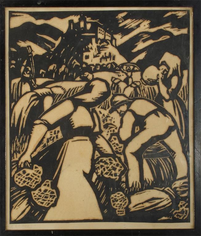 'Reapers' a Linocut print probably English, framed indistinct signature image 33.5cm x 28.5cm