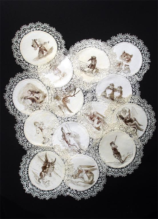 A set of linen placemats each decorated with Alice in Wonderland characters, comprising twenty square and twenty five circular coasters unsigned 28cm. square
