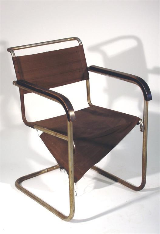 A tubular steel and wood armchair, designed by Ludwig Mies van der Rohe, with canvas seat and back support, 83cm. high.