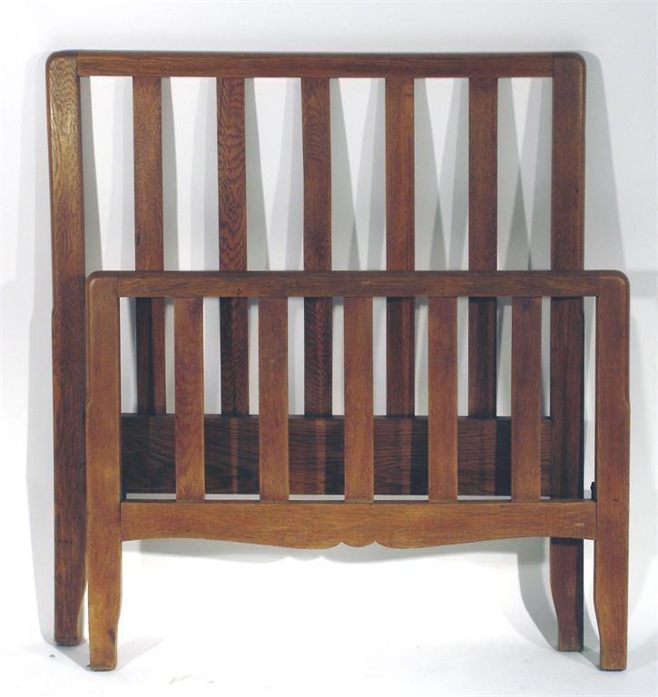 A Heal's Letchworth oak single bed and a Heal's rush seated oak chair applied label to bed 103cm. high 92cm wide