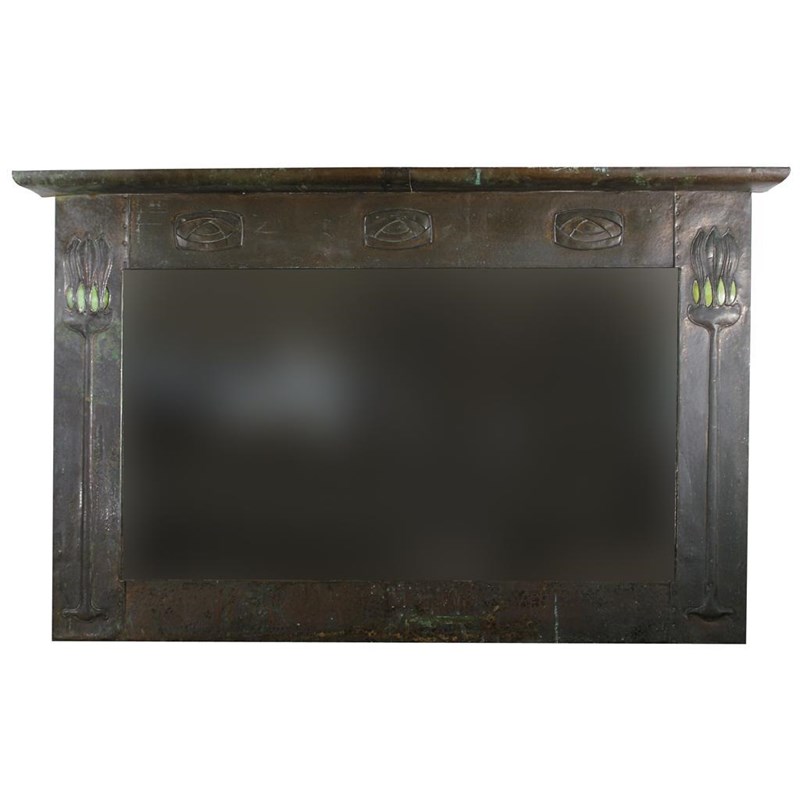 A large Glasgow School patinated copper overmantel mirror with three stamped Glasgow Rose motif, the sides with single stylised flower stem set with green enamel roundel unsigned 124 x 78cm.