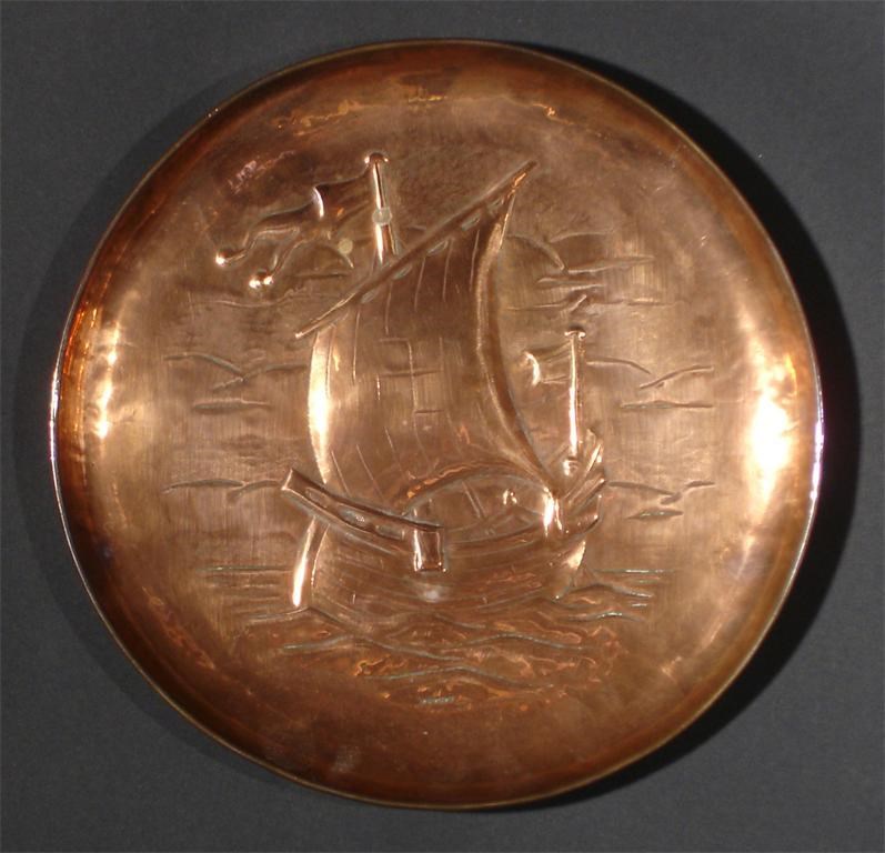A Newlyn copper tray circular, stamped with a sailing vessel at sea stamped Newlyn 20.5cm. diam.