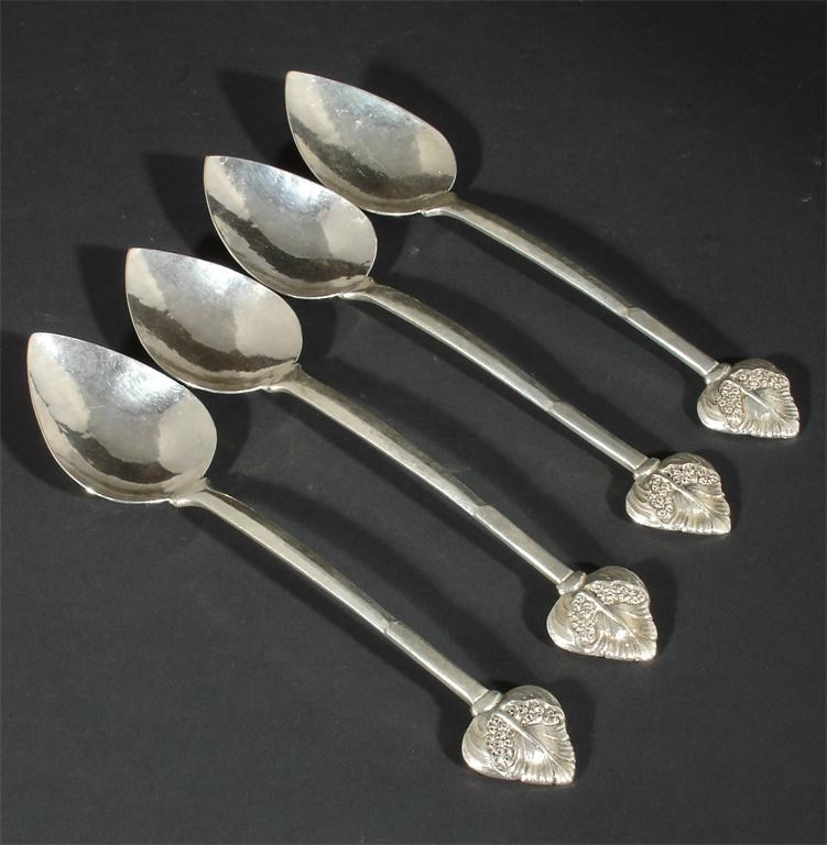 Four Arts and Crafts silver spoons hammered, pointed bowls and foliate terminals, stamped marks, JSR Birmingham 1927 18cm. long