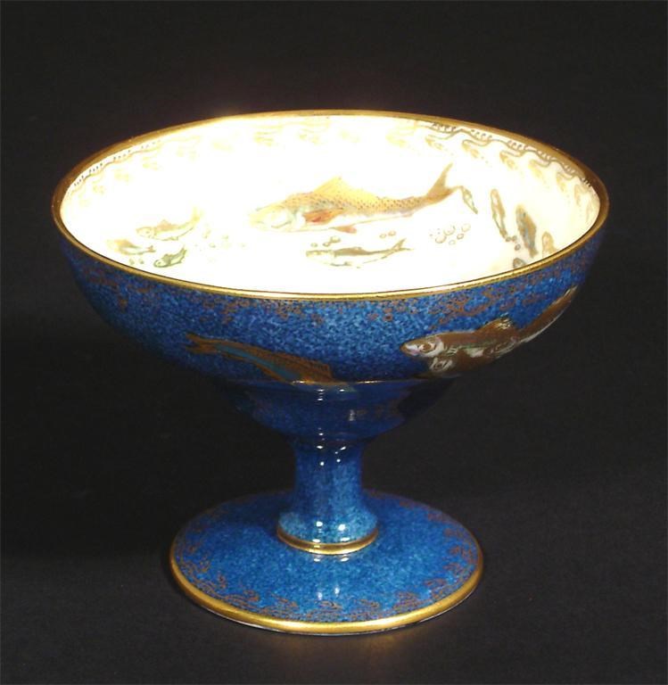 A Wedgwood lustre pedestal bowl printed and painted in colours and gilt with fish on a pearl lustre interior, the exterior powder blue printed mark 8cm. high