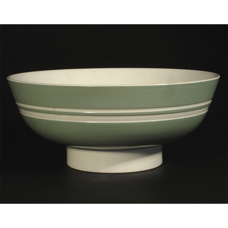 A Wedgwood earthenware pedestal bowl designed by Keith Murray, shape no. 4194, celadon with carved grooved bands impressed and printed marks, KM monogram 28cm. diam.