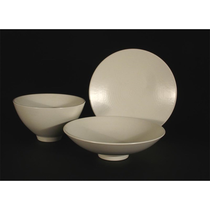 A rare Wedgwood trio designed by Norman Wilson, comprising deep bowl, shallow bowl and plate, covered in a matt white glaze impressed mark, NW plate 21.5cm. diam.