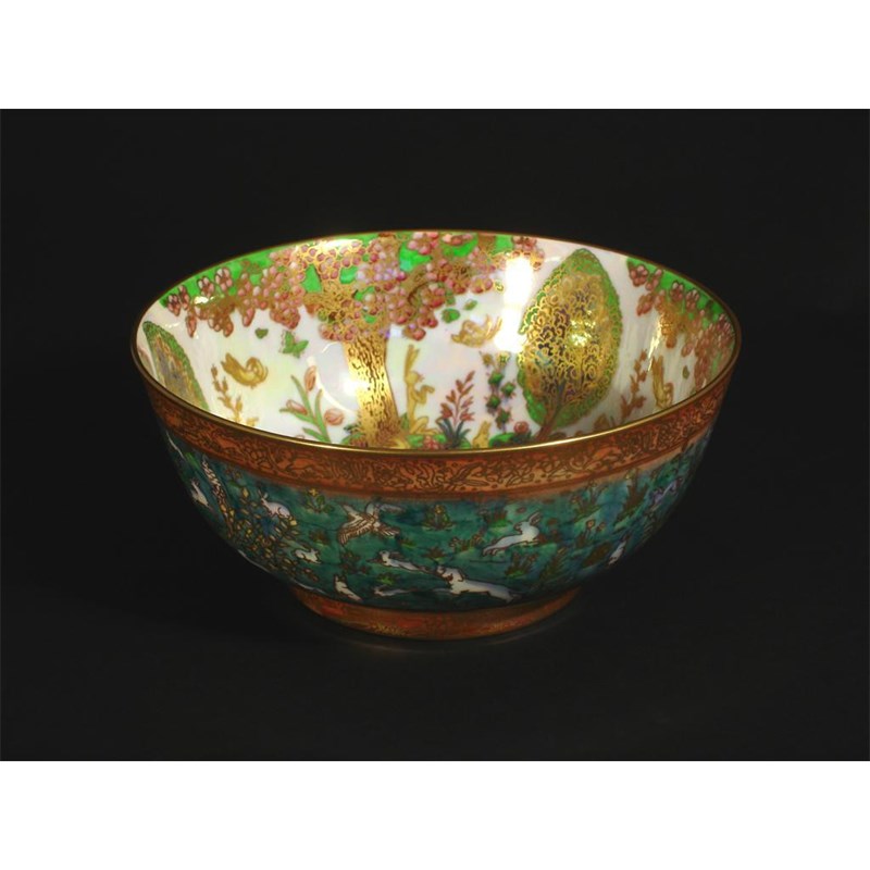 'Hares, Dogs and Birds' a rare Wedgwood Fairyland lustre Imperial bowl designed by Daisy Makeig-Jones, printed in colours and gilt on a green lustre ground, the interior pearl lustre printed and painted marks, minor nicks to  base rim 23cm. diam.  This design was introduced in November 1927 and cancelled in December 1929.
