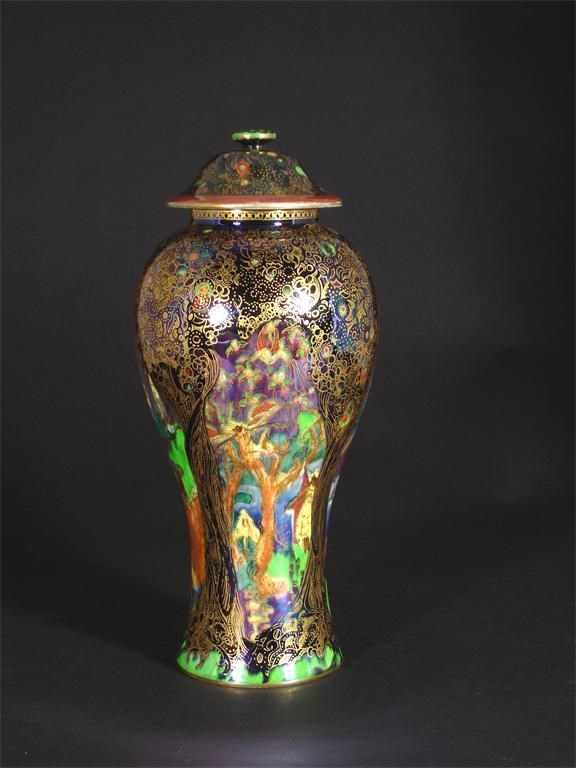 'Jewelled Tree' a Wedgwood Fairyland lustre vase and cover designed by Daisy Makeig-Jones, printed and painted in colours and gilt on a black lustre ground printed mark 29cm. high