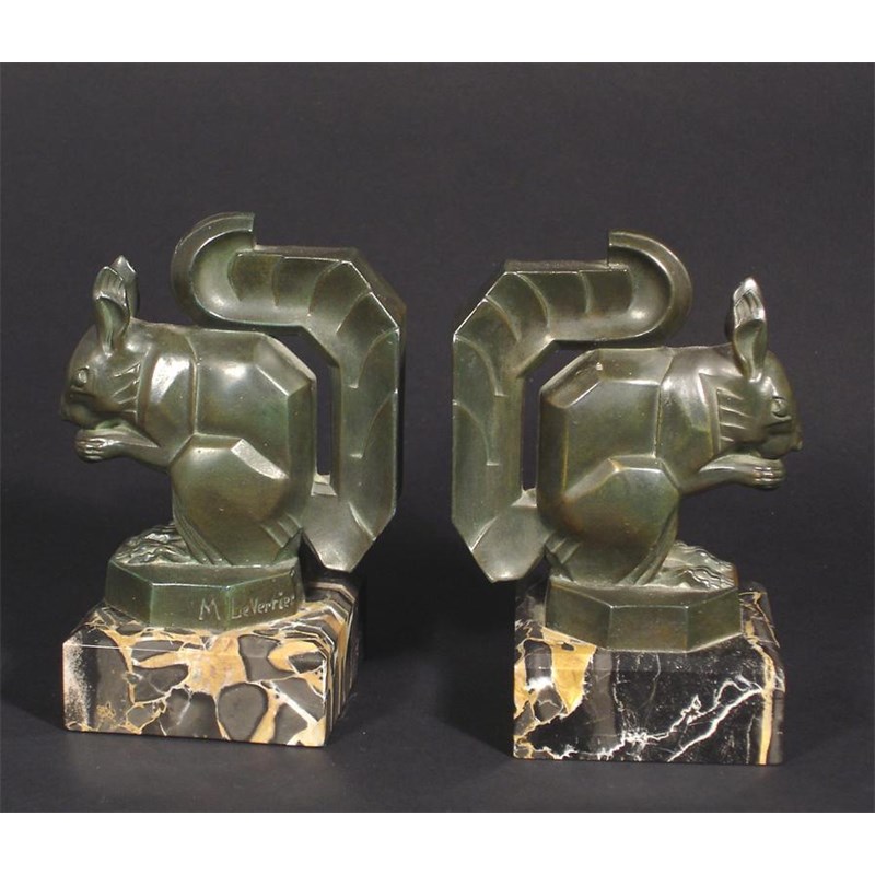A pair of patinated bronze book ends cast from a model by Max Le Verrier, each modelled as a squirrel eating an acorn, on veined marble base signed in the bronze 16cm. high