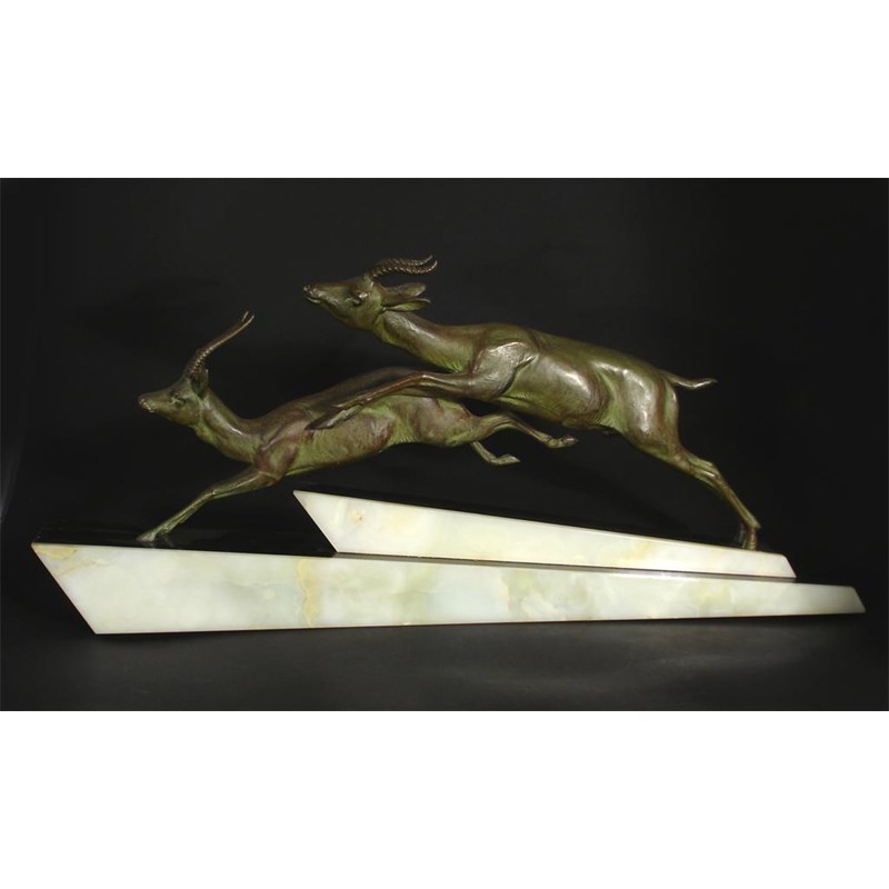 A spelter model of two leaping gazelle cast from a model by Longfils, on angled onyx vase etched signature, minor chips 66cm. wide