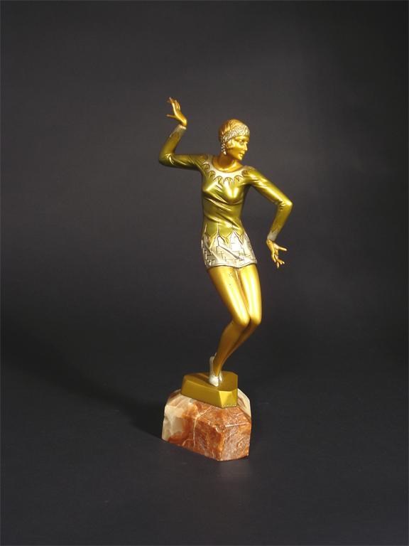 'Red Dancer' a bronze cast from a model by Ferdinand Preiss, on shaped, triangular section marble base signed in the bronze F Preiss 35.5cm. high
