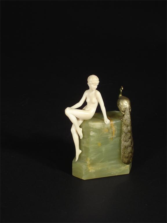'Woman with Peacock' an ivory figure carved from a model by Ferdinand Preiss, on onyx base signed in the onyx F Preiss 10.5cm. high