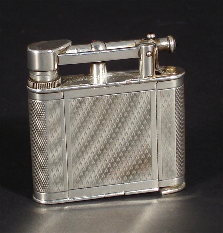 A Dunhill novelty Lighter electroplated vanity case designed 1928 with engine turned casing, containing hinged mirrored powder, lipstick, eyebrow pencil and scent flask stamped marks 6cm. high