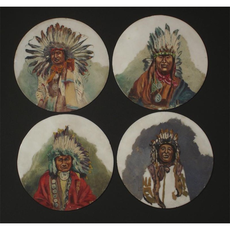 Four painted glass Red Indian portrait roundels indistinctly named unsigned, minor rim nicks 13.5cm. diam.