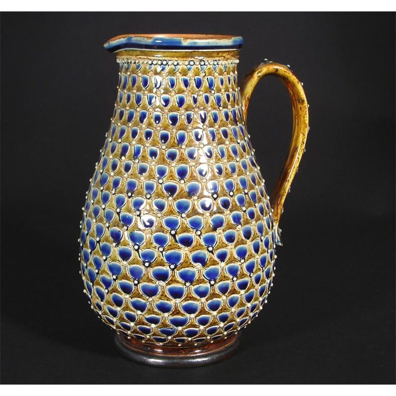 A Doulton Lambeth stoneware jug incised and applied with a geometric repeat in shades of blue and ochre impressed marks, NA monogram 24cm. high