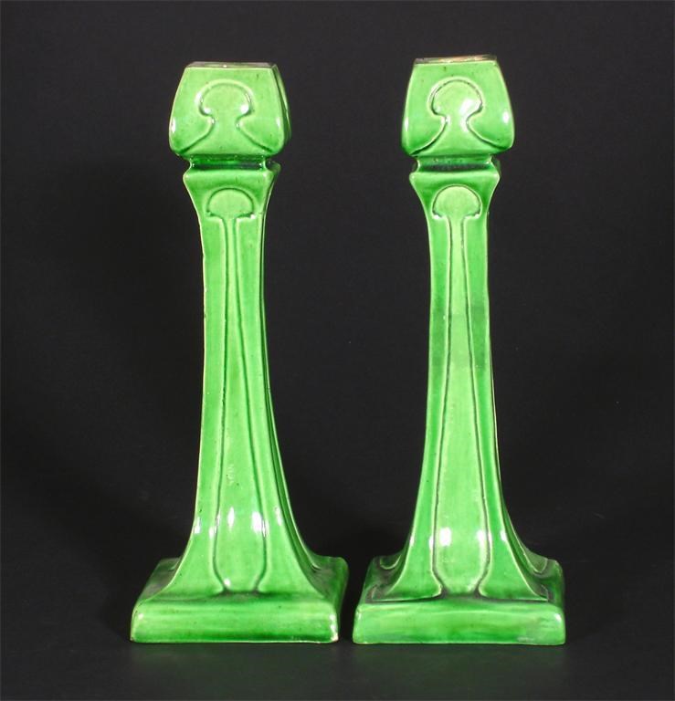 A pair of Burmantoft's Faience candlesticks tapering square section, covered in a green glaze impressed factory mark 23cm. high
