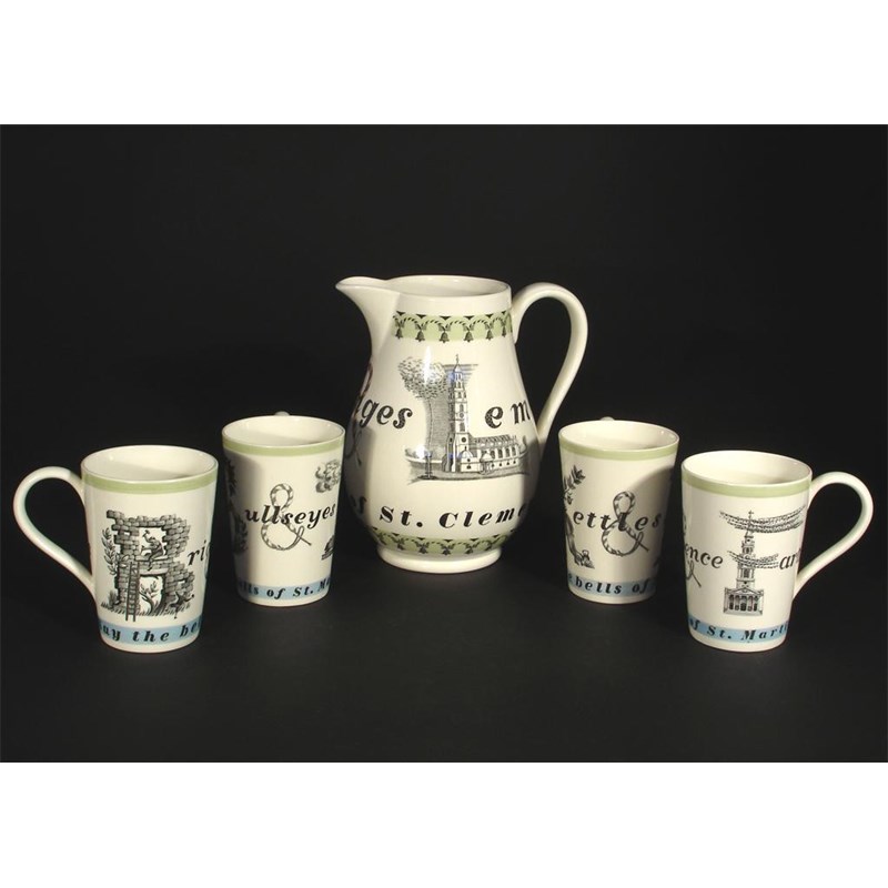 'Oranges and Lemons' a Wedgwood Lemonade jug and four beakers designed by Richard Guyatt, made for Liberty's printed with the songs churches, in colours printed marks, small chip to base rim of one beaker, jug 19cm. high