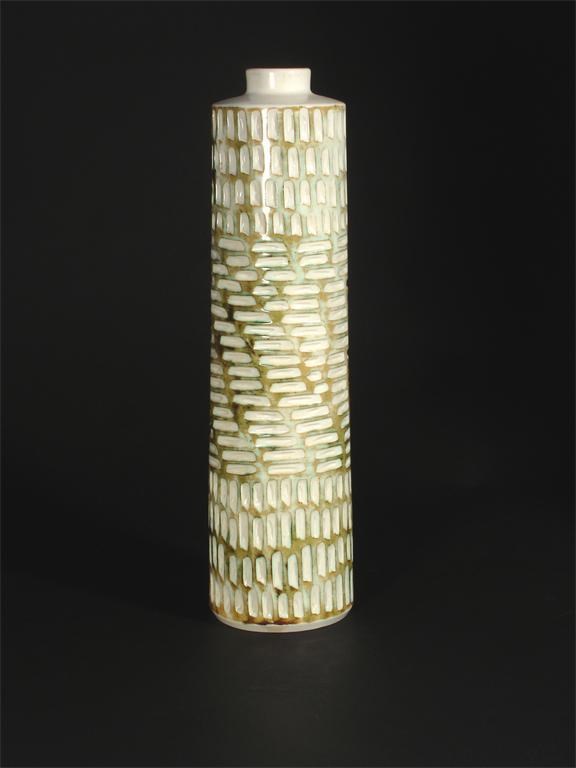 A Poole Pottery studio vase designed by Robert Jefferson, thrown by Guy Sydenham and carved probably by Tony Morris, cylindrical form with bands of horizontal and vertical grooves, glazed blue green over white printed Poole Studio England 39.5cm. high