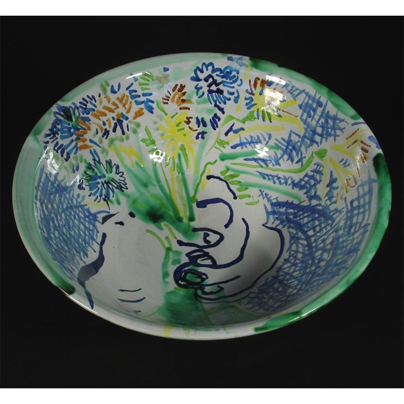 A Fulham Pottery tin-glazed earthenware bowl by Philip Sutton painted with a hand offering a bunch of flowers painted marks, Philip Sutton 1987 Fulham Pottery JP 32,5cm. deep.