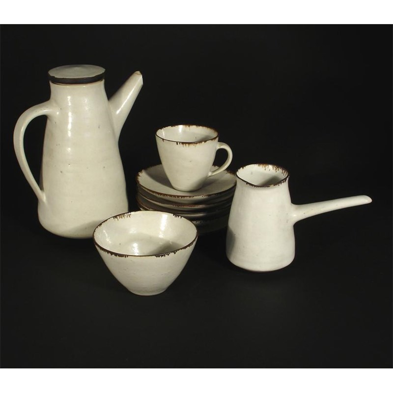 A Lucie Rie and Hans Coper stoneware coffee set comprising tall coffee pot and cover, milk-jug with pulled handle, sugar basin, five cups and saucers, oatmeal glaze with bronze rim various LR and LR & HC seal marks, chips coffee pot 21.5cm. high