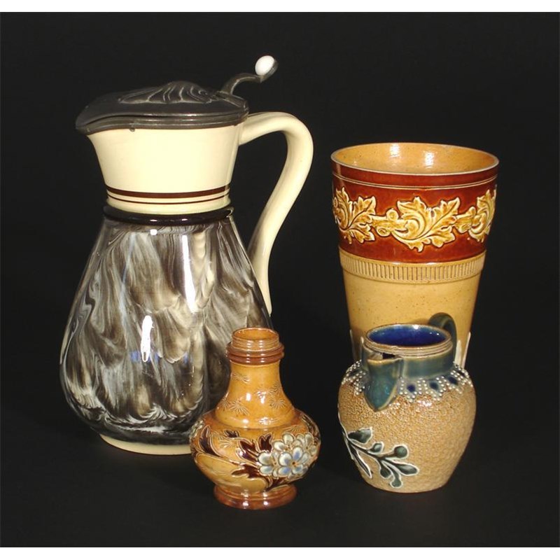 A James Macintyre jug with pewter cover with marbled glaze, and three Doulton stoneware items impressed marks, damages to Doulton jug 17cm. high