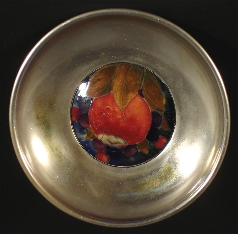 'Pomegranate' a Moorcroft Pottery roundel set in English Pewter dish, painted in colours stamped mark to pewter 12cm. diam.