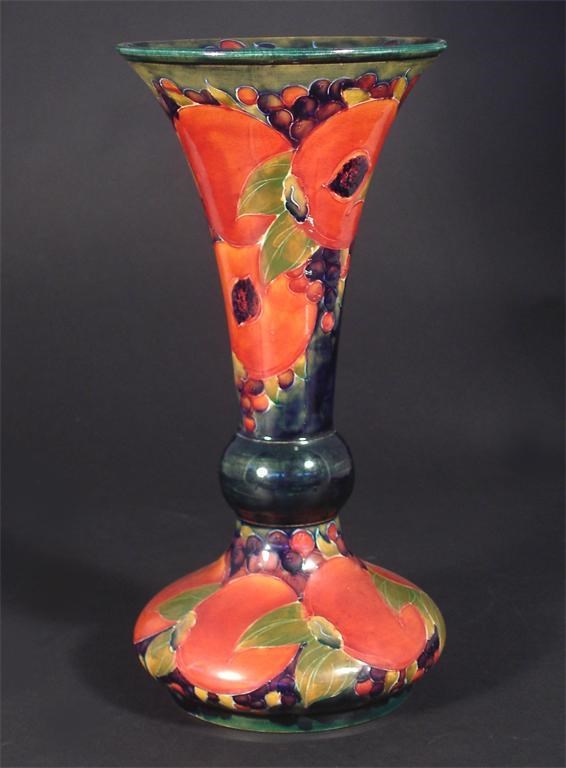 'Pomegranate' a Moorcroft Pottery vase designed by William Moorcroft, compressed form with knopped flaring neck impressed marks, painted green signature 33cm. high