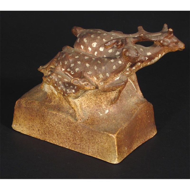 A Stella Crofts stoneware deer family group dated 1928, naturalistically glazed in brown with silver spots incised Stella R Crofts 1928 14.5cm. high