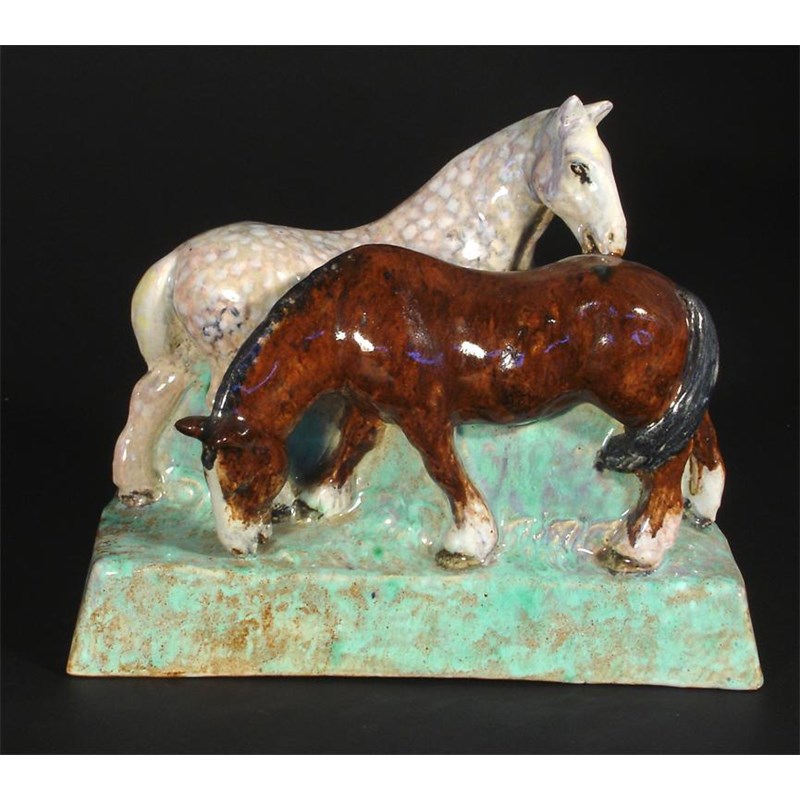 A Stella Crofts stoneware horse family group modelled resting, glazed naturalistically, incised Stella R Crofts, restored ears 24cm. wide