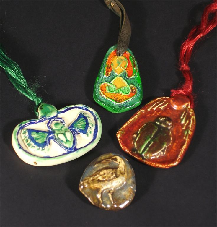 A rare Stella Crofts stoneware brooch modelled in low relief with a Curlew, glazed in colours, and two Ymagynatyf, Chelsea pendants and a Waldram Pottery pendant main unmarked, rest impressed marks or paper labels Crofts Brooch is 3cm wide Provenance Stella Crofts Studio These items were found in Stella Crofts studio and sold at her Studio sale.