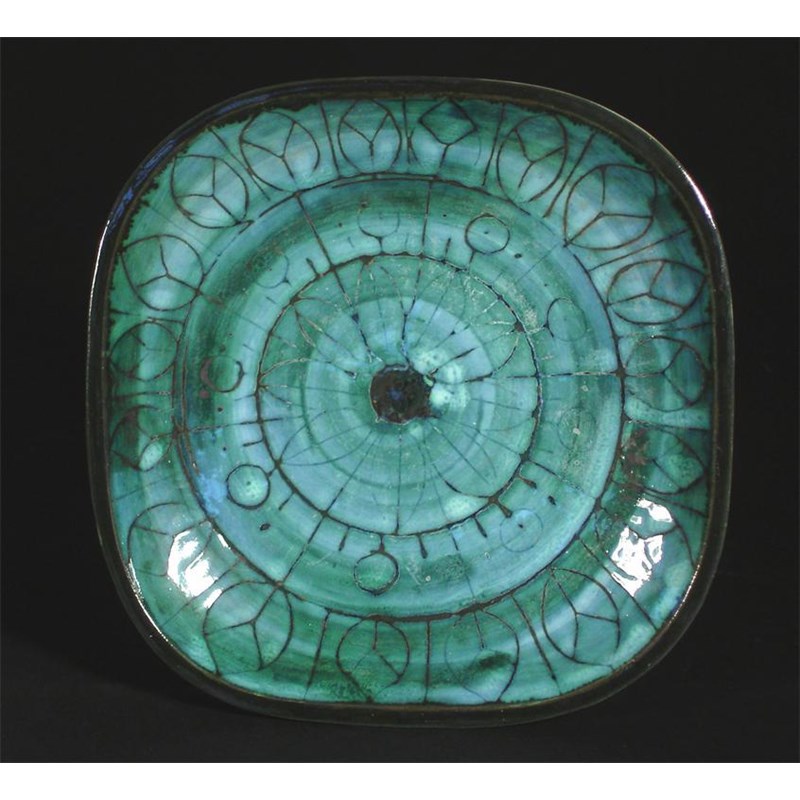 An early Troika pottery square dish painted with central flower motif, in blue and black impressed marks and trident mark, restored 18.5cm. diam.