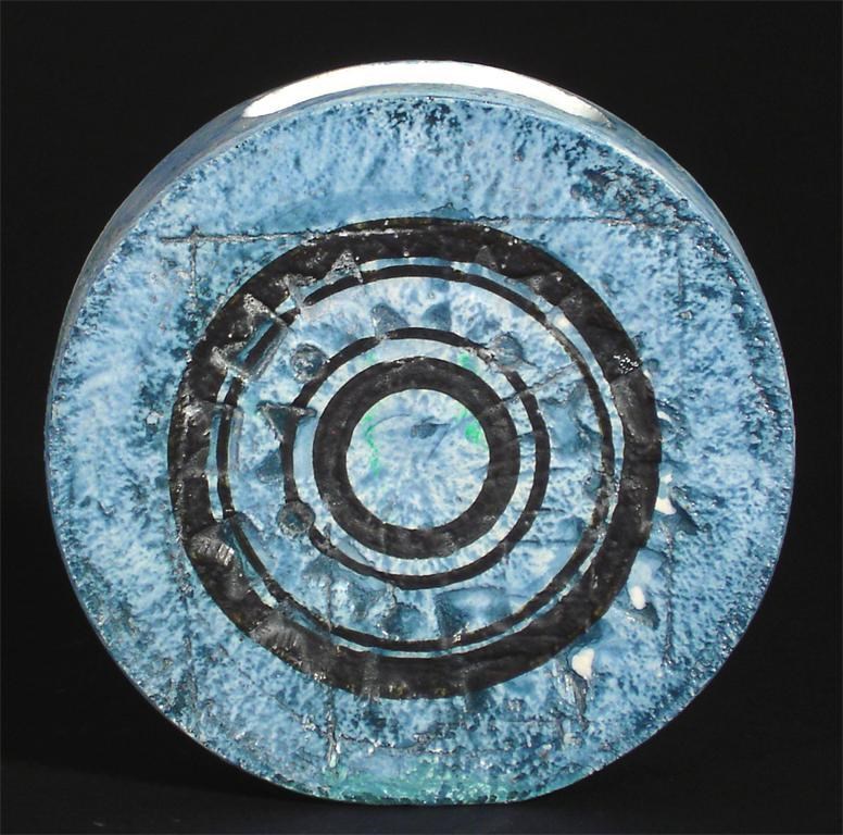 A Troika Pottery small wheel modelled in very low relief, painted black circles on blue ground painted marks artist monogram, small chip to rim 11.5cm. high
