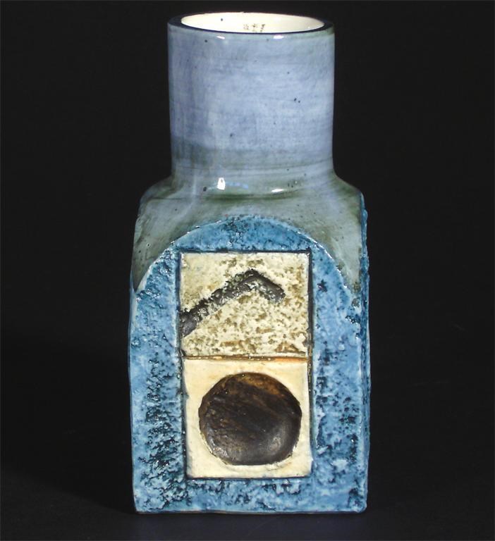 A Troika Pottery Spice Jar modelled in low relief, in shades of green and ochre on a blue ground painted marks AB monogram 15cm. high