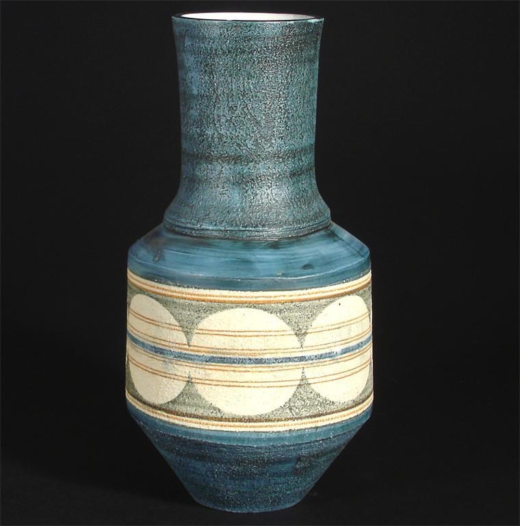 A Troika Pottery Urn vase painted with a band of circles in shades of green and brown on a blue ground painted marks, PB monogram 25.5cm. high