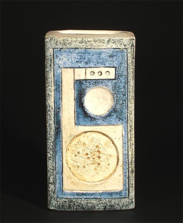 A Troika Pottery Rectangular vase modelled in low relief with geometric design, in shades of blue, green and ochre painted marks JD monogram 21.5cm. high