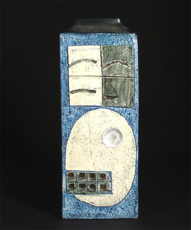 A Troika Pottery large rectangular vase modelled in low relief with geometric panels, in shades of green and ochre on a blue ground painted marks AB monogram 29cm. high