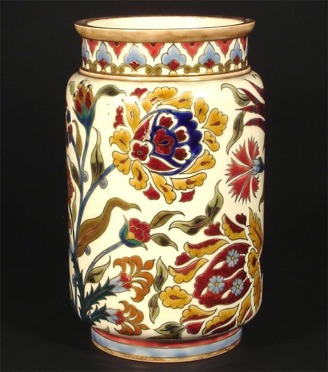 A Zsolnay Pecs earthenware vase cylindrical form painted in colours and gilt on a cream ground with flowers printed marks 24cm. high