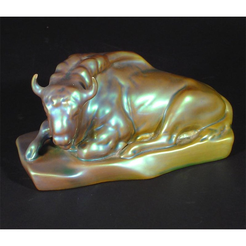 A Zsolnay Pecs model of a European Bison covered in a golden green lustre glaze printed mark, chip to horn 21cm. wide