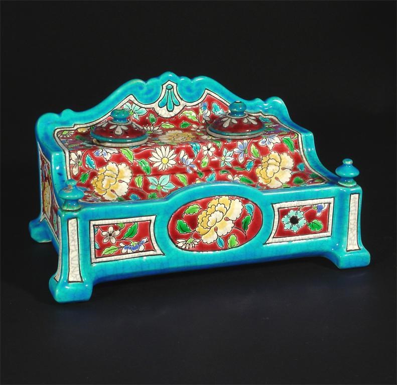 A Gien Pottery ink stand twin ink well form, enamelled with floral design printed mark 20cm. wide