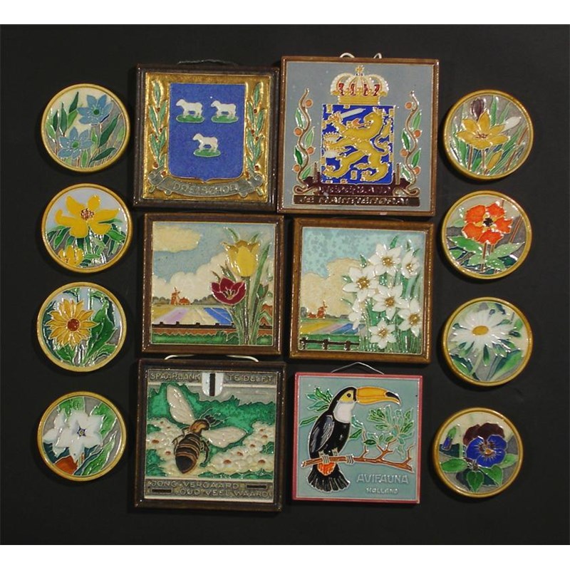 A collection of Dutch Delft tiles decorated with Dutch scenes, and nine Westraven, Utrecht flower tile roundels impressed marks largest 19cm. wide