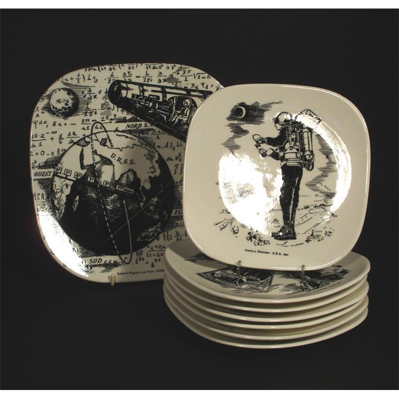 An interesting Gien Space Travel sandwich set printed in black with space and aeronautical vignette printed marks sandwich plate 26cm. diam.