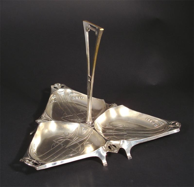 A W.M.F silvered metal sweet meat dish triangular section, cast in low relief with Secessionist flower stems stamped marks 32cm. wide
