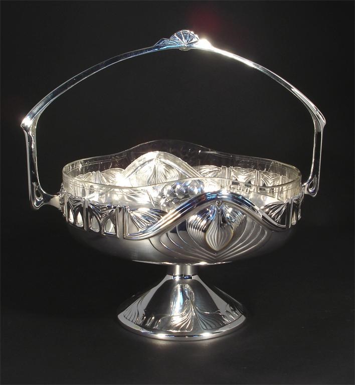 A WMF pewter and glass pedestal fruit bowl cast in low relief with Art Nouveau floral panels stamped marks 30cm. high