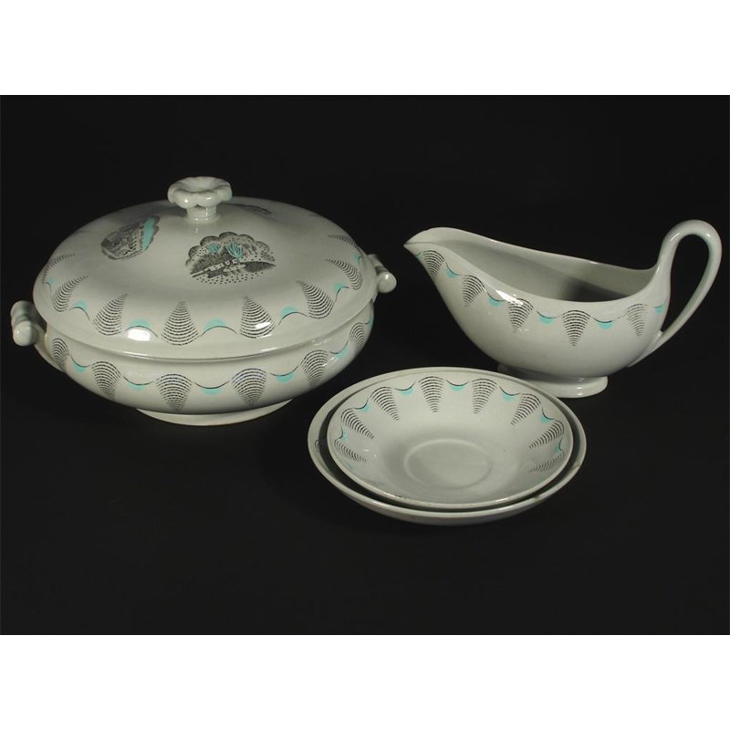 'Travel' A Wedgwood tureen, cover, sauce boat and two saucers designed by Eric Ravilious, printed in black and blue with travel vignette on a grey ground printed marks, damages tureen 21cm. diam.