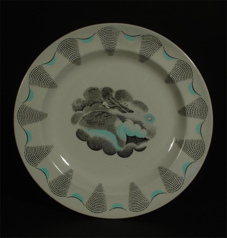 'Travel' a Wedgwood plate designed by Eric Ravilious, printed in black and blue with a bi-plane vignette on a grey ground printed and impressed marks 21cm. diam.