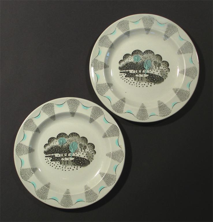 'Travel' two Wedgwood side plates designed by Eric Ravilious, printed in black and blue with wind blown tree landscape on a grey ground printed and impressed marks, restored rim to one 17.5cm. diam.