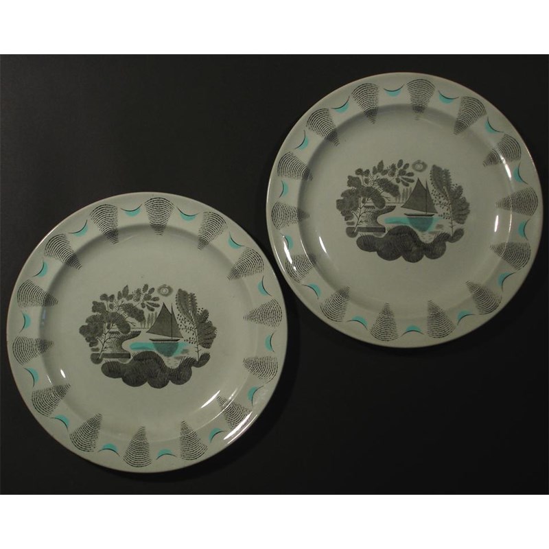 'Travel' Two Wedgwood plates designed by Eric Ravilious, printed in black and blue with yachts on a lake, on a grey ground printed and impressed marks, restored rim to one 25cm. diam.