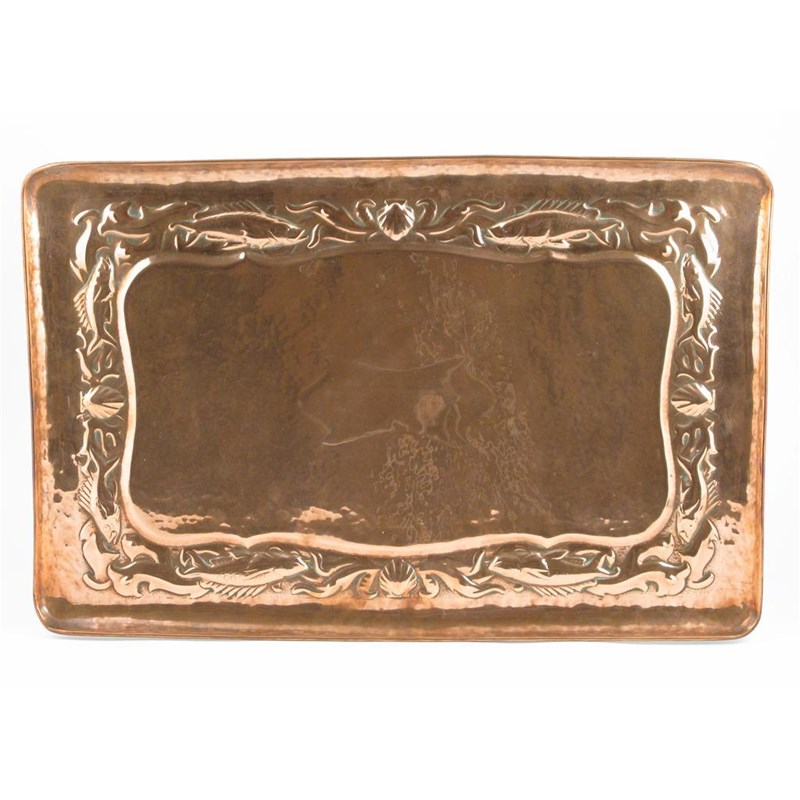 A large Newlyn copper tray rectangular section, hammered in relief with a frieze of fish, weed and shells stamped Newlyn 61cm. wide